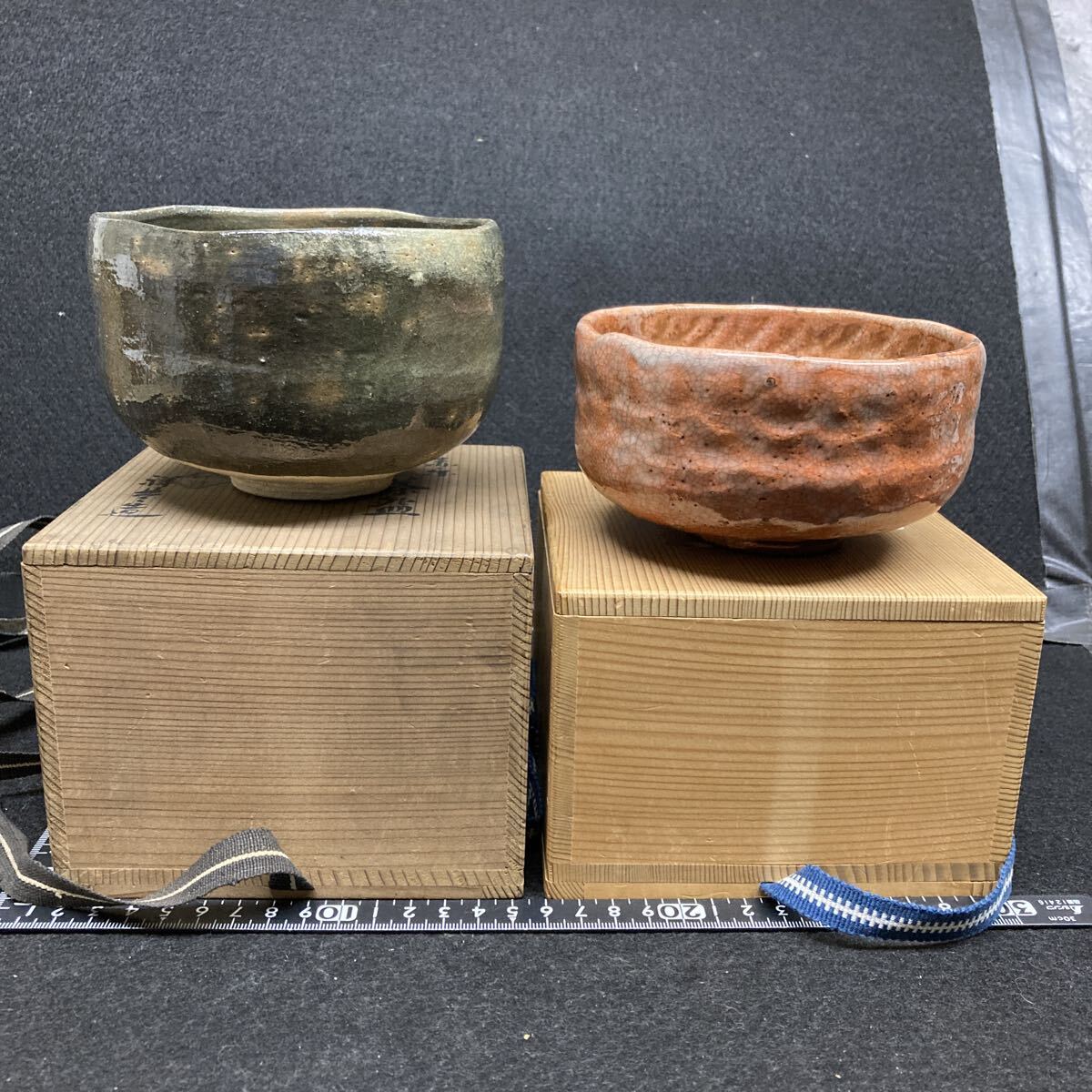 > ★茶道具 赤楽焼き 抹茶碗 陶印有り 作者不詳 合い箱付き ★茶道具 楽焼き 抹茶碗 祥豊造 共箱付き 二点組 赤楽虫食い有