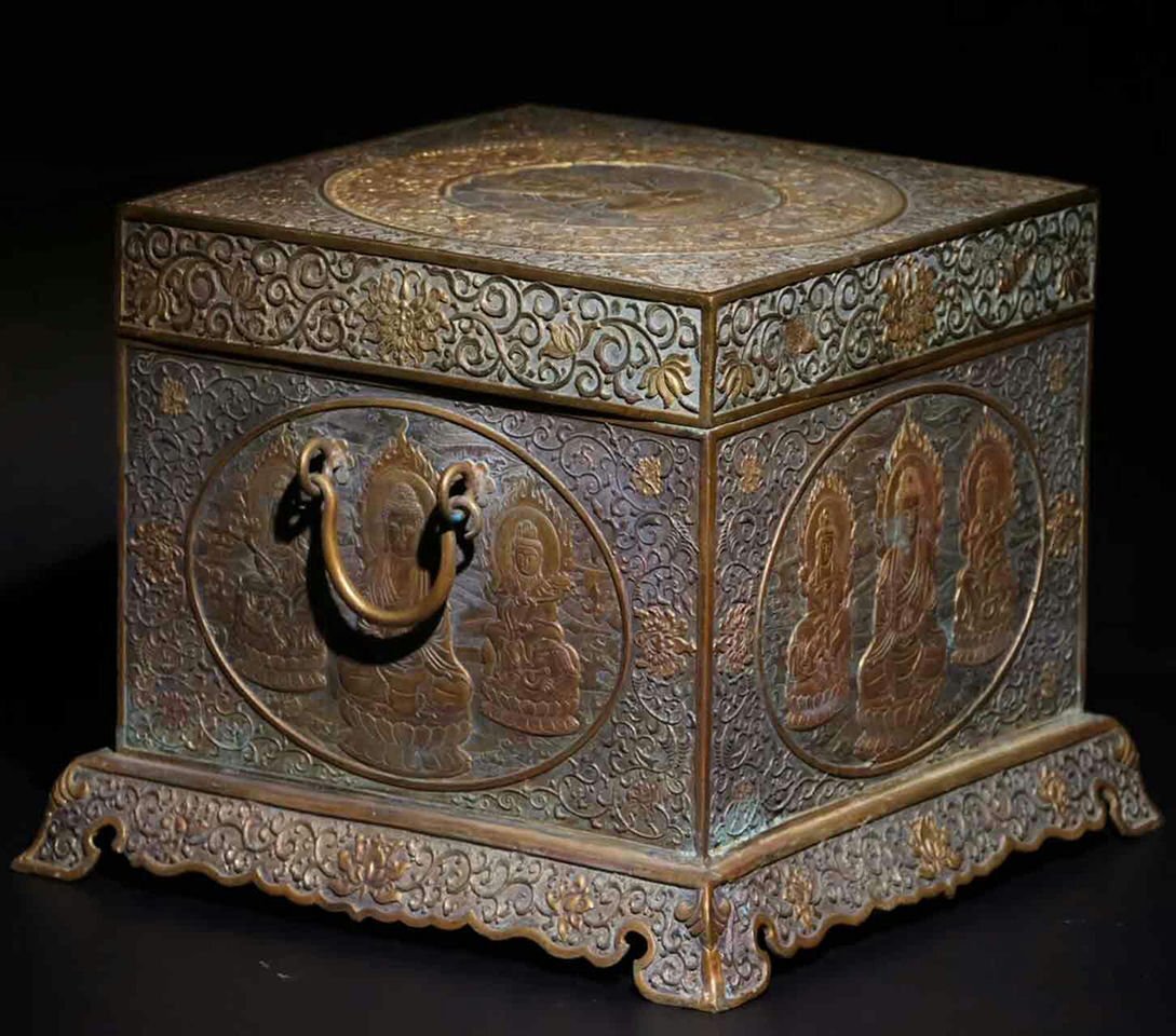 - ▼渡鶴羽▼H3184清時代 銅塗金 藏経盒 細工彫刻★仏教古美術★細密細工★廃寺旧蔵★廃寺買出品