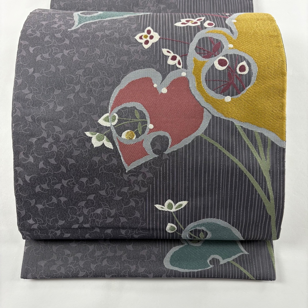- 袋帯 秀品 草花 金糸 灰紫 お太鼓柄 正絹 【中古】
