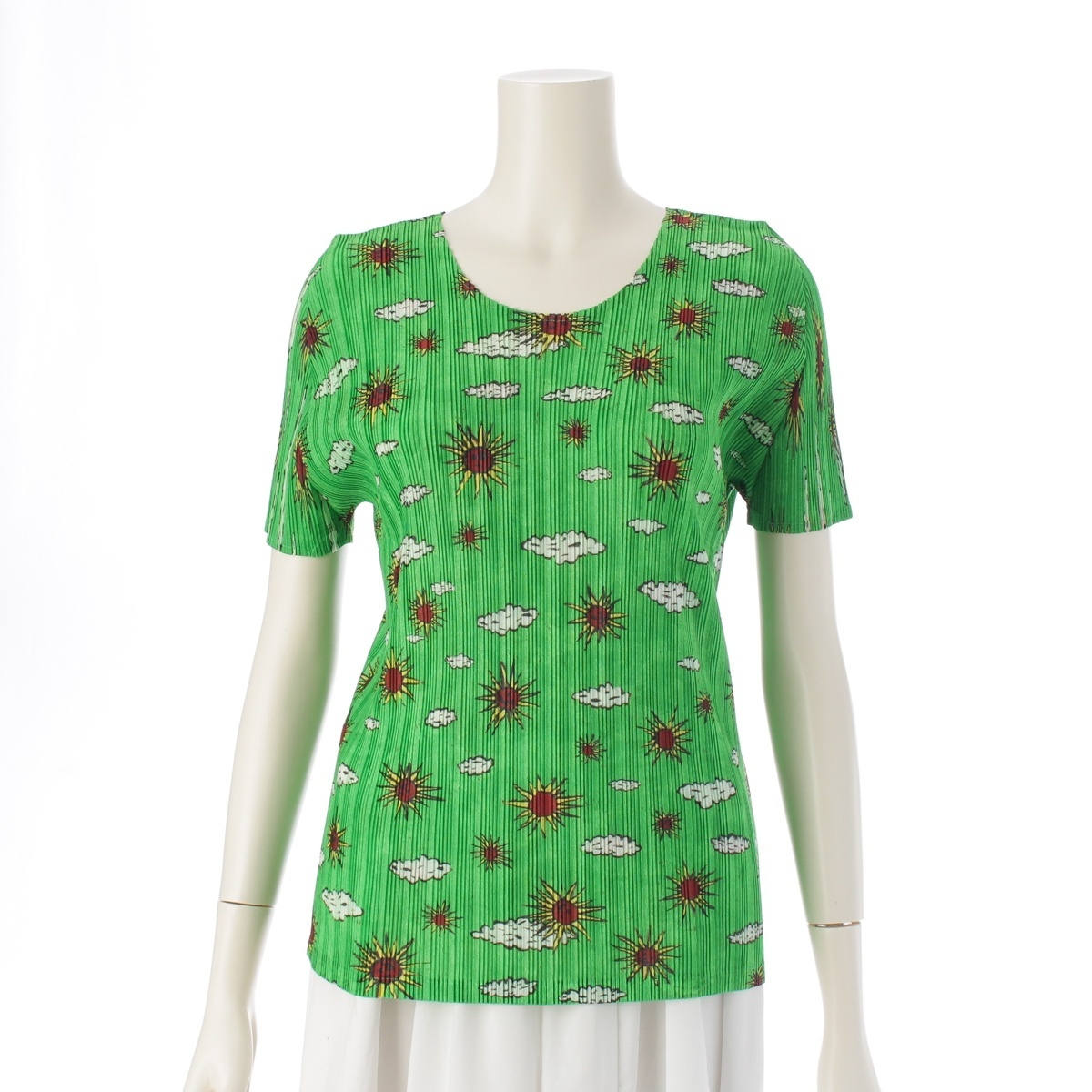 - プリーツプリーズ イッセイミヤケ 半袖トップス 太陽 雲 向日葵 トップス PP18-FK382 グリーン 5【中古】
