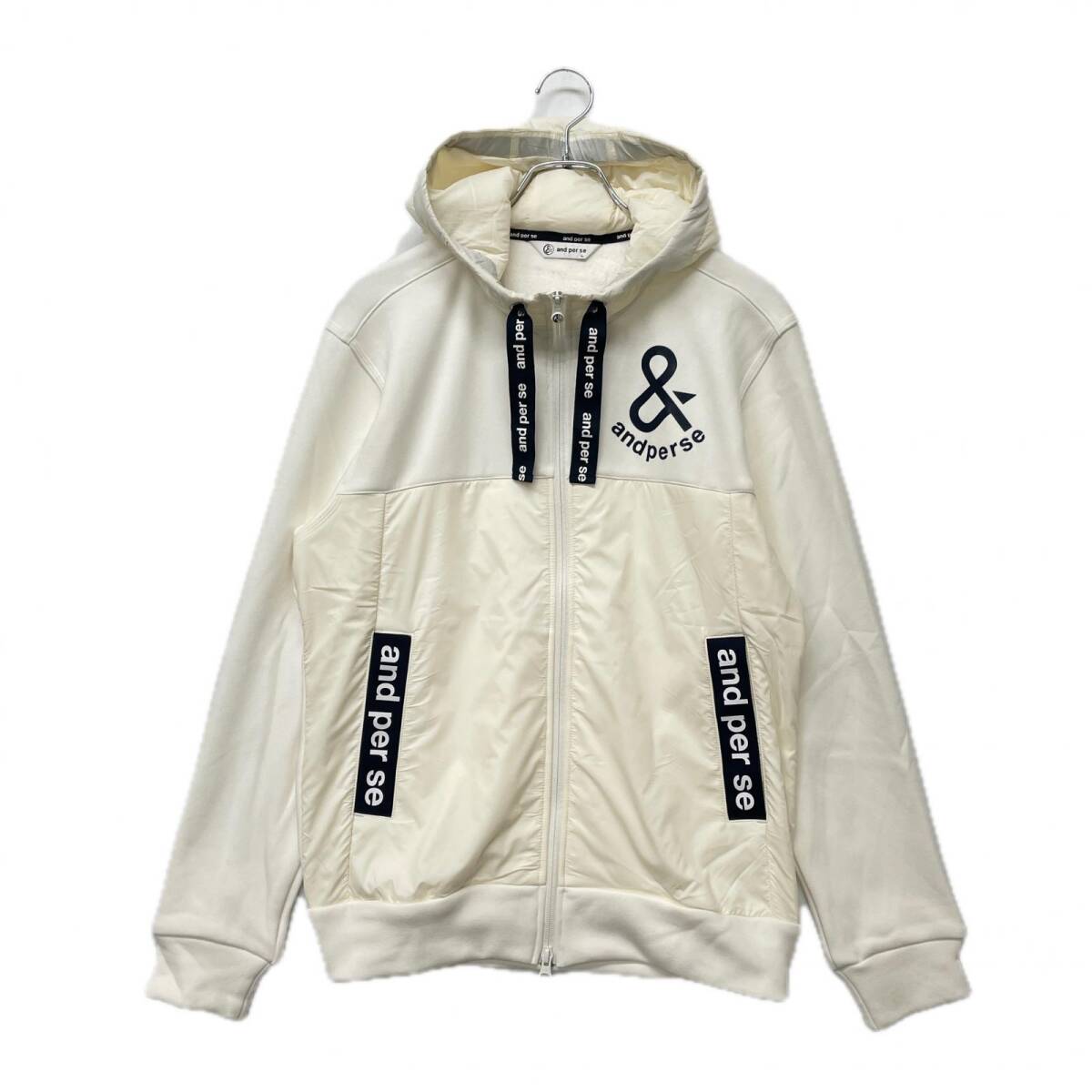 > coco 未使用品 アンパスィ and per se メンズ ブルゾン L ホワイト ロゴプリント 中綿入り ダブルジップ パーカー スポーティ 104328