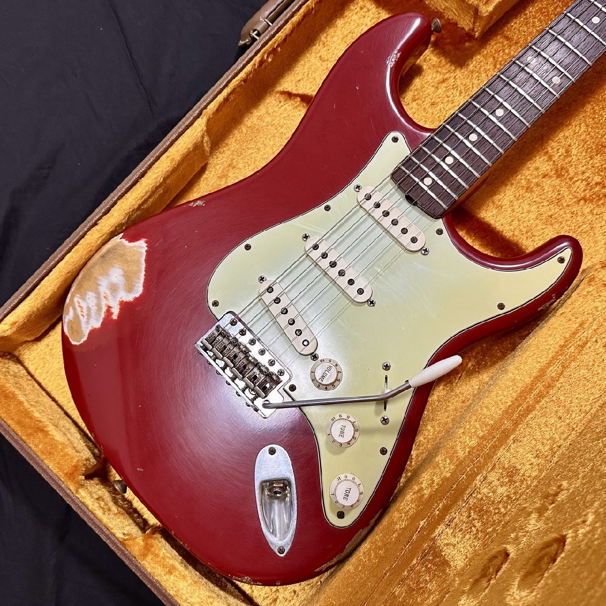 1960年代製のFender Stratocasterを忠実に再現したFender Custom Shop製のStratocaster。本機はリッチな色合いを纏うDakota Redのマッチングヘッド仕様、1960年代に採用されていたスラブボードまで忠実に再現されたモデルです。ボディだけでなくネックにもしっかりと弾き込まれたようなレリック加工が施されており、触りたてでも手に馴染む弾きやすさが魅力です。