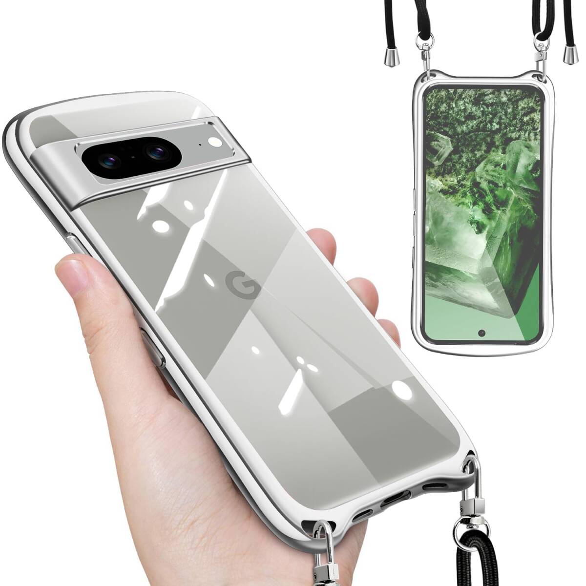 > (シルバー) スマホケース 8 8 Pixel Pixel 可愛い 韓国 薄型 全面保護 耐衝撃 メッキ加工 TPU 斜めかけ 縄