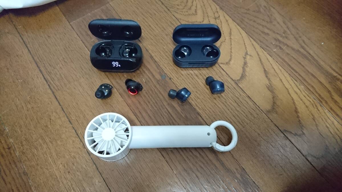 > 【雑貨】 ノーブランドまとめて ワイヤレスBluetoothイヤホン2点+充電式ハンディーファン1点 動作確認済み