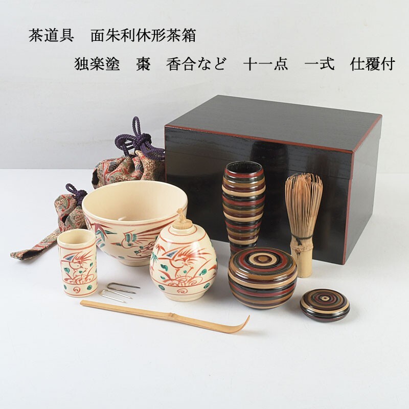 - 茶道具 面朱利休形茶箱 独楽塗 棗 香合など 十一点 一式 仕覆付 MLVR