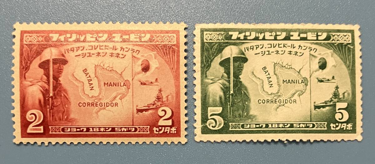 - 南方占領地切手 フィリピン 2C、5C バターンコレヒドール陥落1周年記念切手 裏糊 丸まり 折れ 1943年 未使用