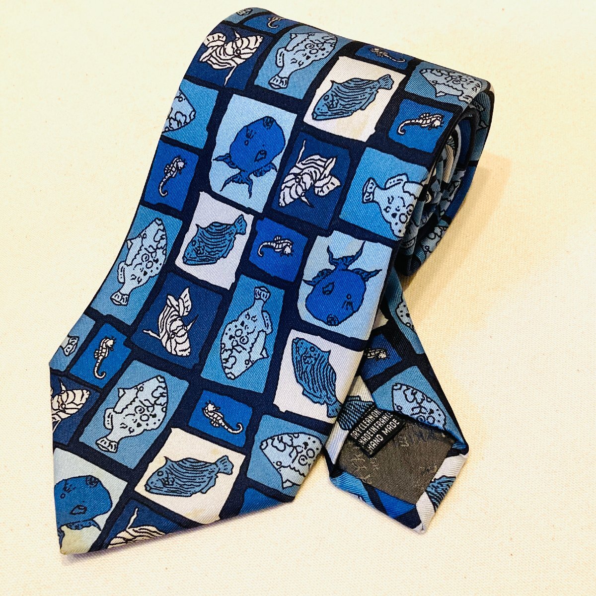 > RYKIEL HOMME リキエル フランス製 絹 シルク SILK 100% 高級 ネクタイ ライトブルー/ブルー系 海洋生物 魚 モチーフ