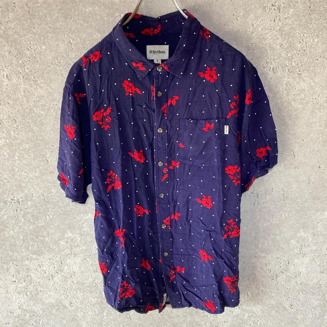 - Rhythm(ONE)半袖シャツ*総柄*花柄*かりゆし*アロハ*ビンテージ*紺