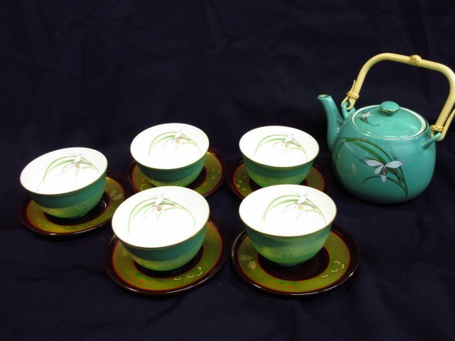 - m6699 美品有 保谷謹製他 えびね蘭 湯のみ/急須/茶托など まとめて 緑色 花柄 金縁金彩 湯のみ口径約9cm