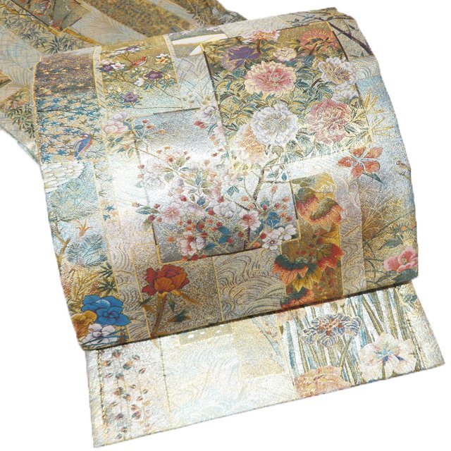 - 袋帯 未使用 正絹 フォーマル 仕立て上がり 全通 西陣 あさぎ 本金箔 本プラチナ箔 近代花鳥図 箔糸 多色 金銀 きもの北條 A1275-16
