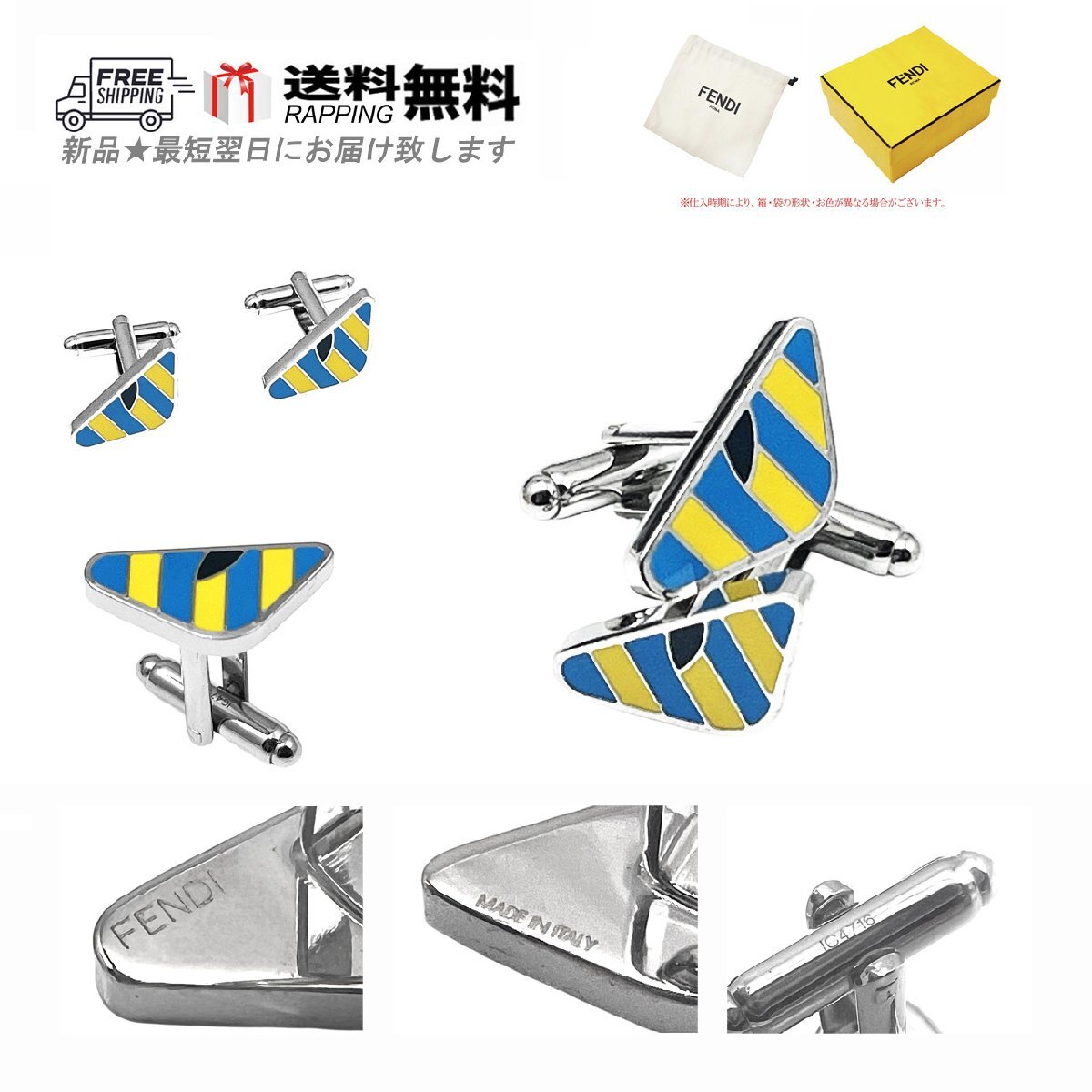 - D805【訳あり】 FENDI フェンディ カフリンクス BUGS バグズ メタル カフス パラジウム ロゴ イタリア製 ★ ブルー+イエロー