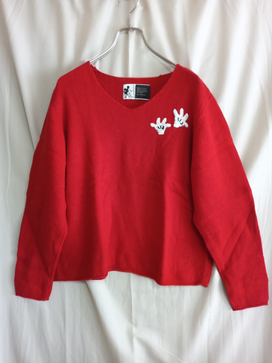 - 12897 ★★ フェリスも ウール・麻混 ミッキーVネックセーター サイズLL 赤