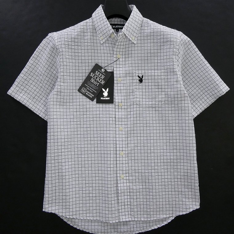 - 新品 プレイボーイ 25年春夏 チェック シアサッカー 半袖 シャツ M 白 【PB252033_7_M】 PLAYBOY ロゴ 刺繍 ボタンダウン コットン混