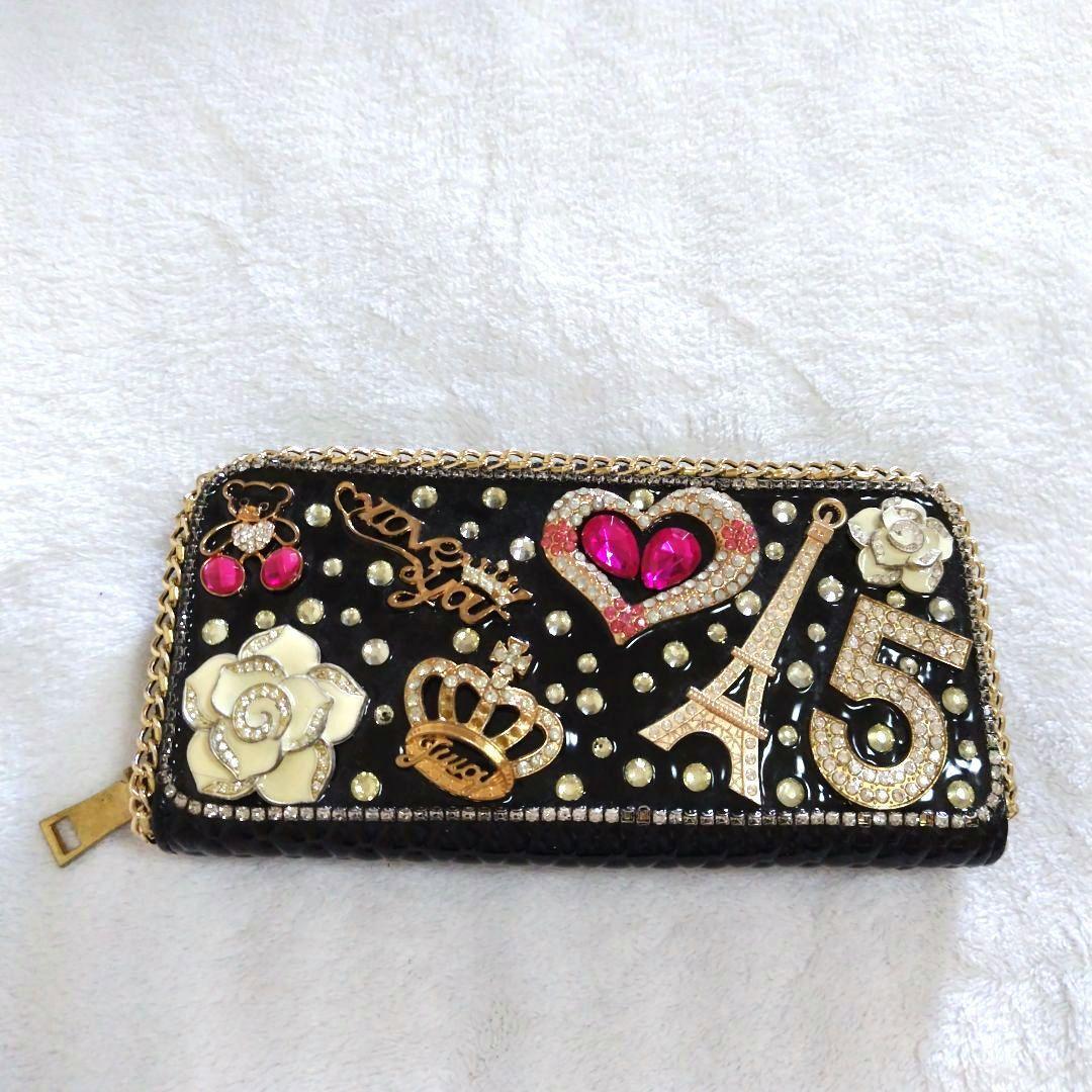 > デコレーション長財布 ビジュー キルティング 平成ギャル グランジ y2k 黒 ウォレット ラインストーン 王冠 クラウン 薔薇 花 テディベア