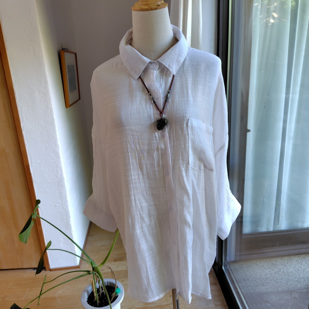 > SUREVE シャツカラー 七分袖チュニック ブラウス アイボリー 楊柳生地 LL ドロップショルダー 後ろ長め 細身え