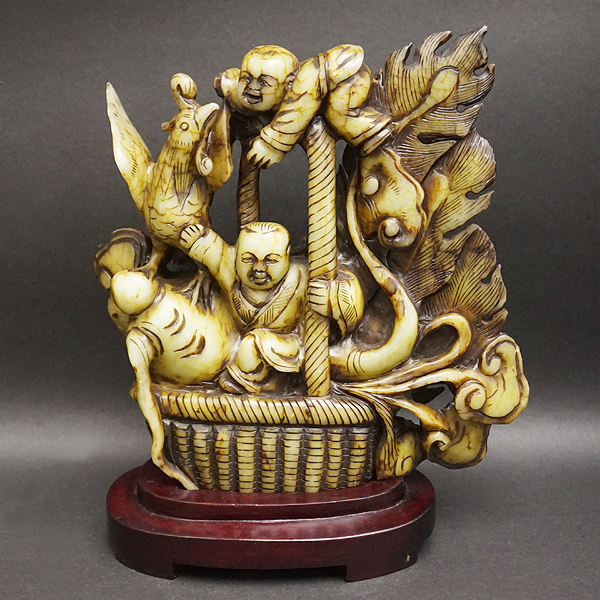 - 中国美術 中国古玩 寿山石 童子 玉製 砡製 砡精密細工造 2380g 東洋彫刻 美術品 唐木台座付 細密細工 唐物 骨董 オブジェ 古美術品