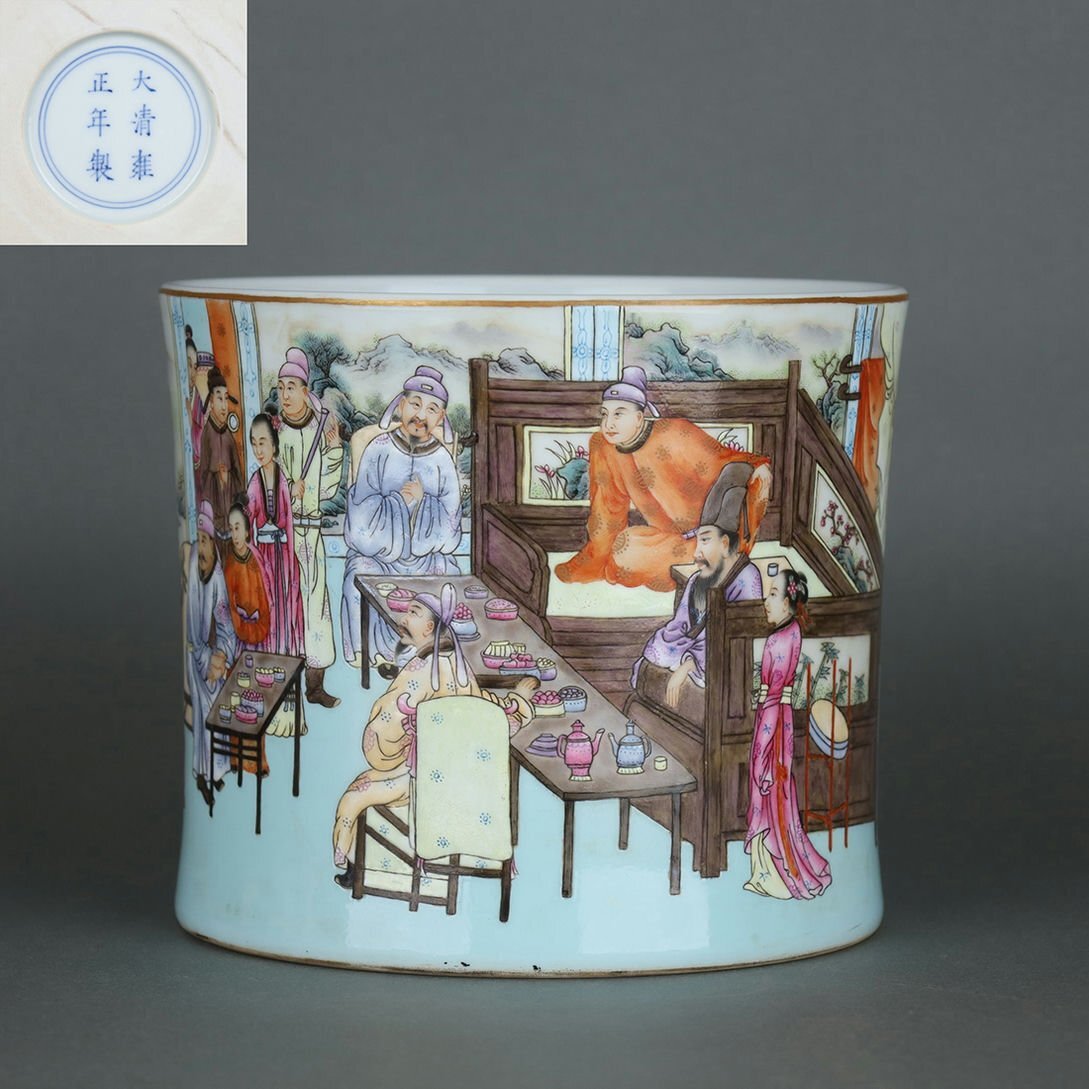 - ▼渡鶴羽▼A684清雍正 緑地粉彩韓熙載夜宴人物詩文図筆筒・古陶磁器 ・珍品旧蔵・古賞物・時代物