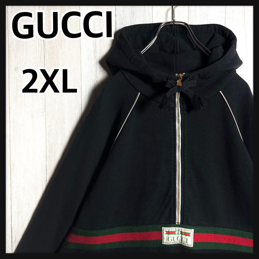 > 【希少2XL・美品】イタリア製 GUCCI グッチ シェリーライン&刺繍ワッペンロゴ ハーフジップ フーディー スウェット パーカー ブラック 黒