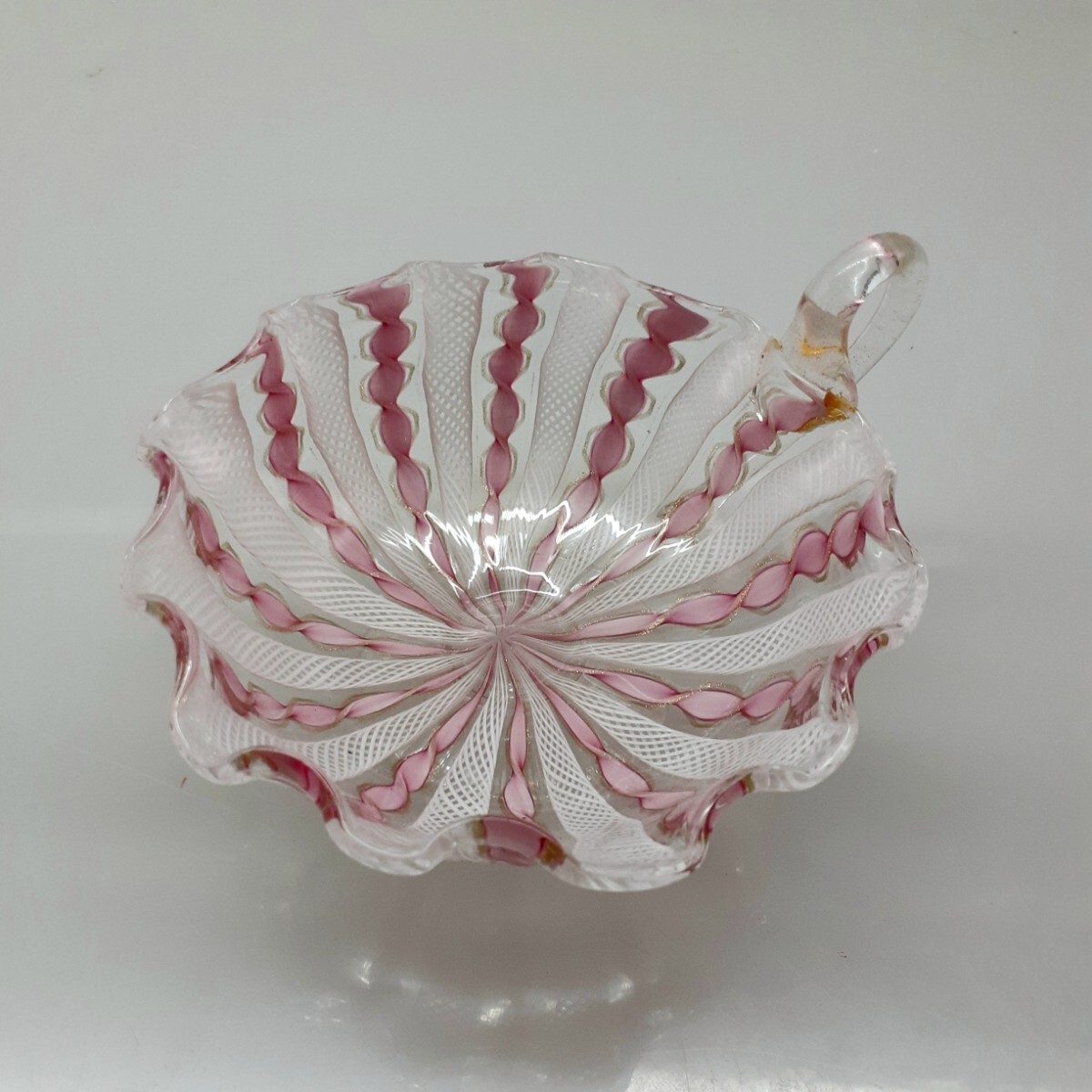 - 【MURANO】ITALY★ムラノ 金彩 ピンク リボン ホワイト レース デザートカップ 皿★ヴェネチアン グラス ムラーノ 島 ベネチアン ガラス