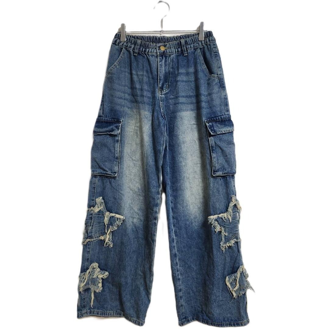 - デニム カーゴパンツ F 青 ユーズド感 ワイド ダメージ加工 ストリート系