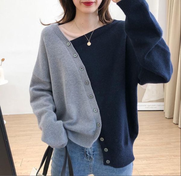 > 新入荷*秋冬 ニット セーター トップス レディース 不規則 配色 セーター 長袖 ゆったり ストレッチ ニットトップス 大きいサイズ*ネイビー