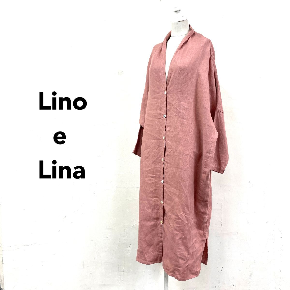- 2K3191-G◆ Lino e Lina リノーエリーナ リネンシャツロングワンピース Vネック 長袖 Iライン サイドスリット ポケット ◆ ピンク 麻