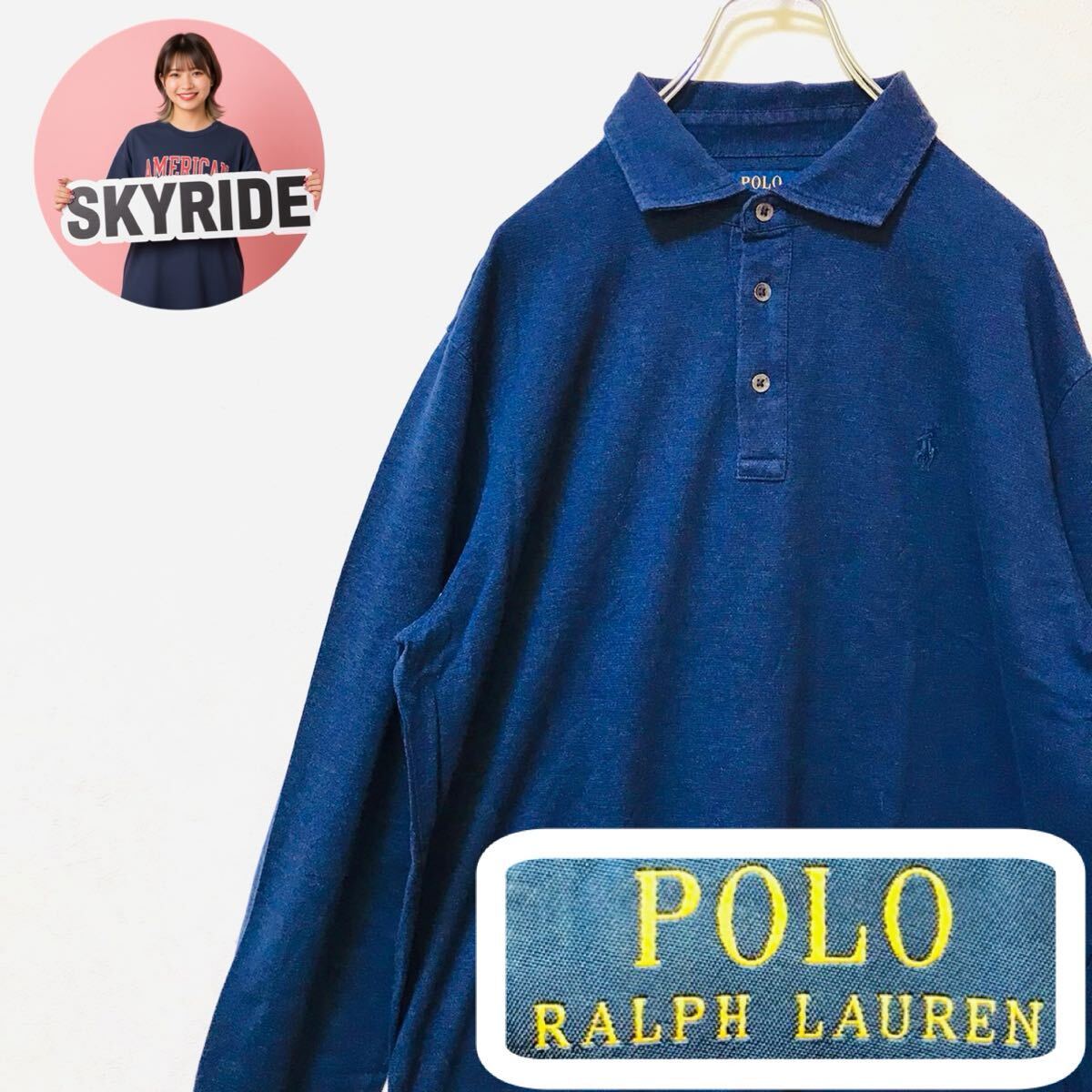 > 【美品】POLO RALPH LAUREN ポロラルフローレン 長袖ポロシャツ ポニー刺繍ロゴ L ネイビー コットン100% ビッグシルエット 古着 #TT0344