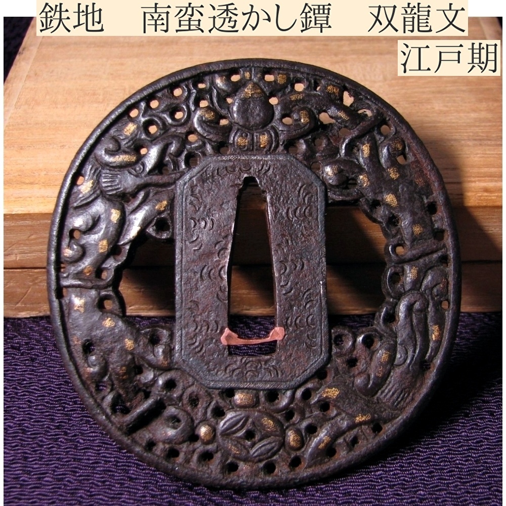 - 時代武具 鉄地透かし鍔 南蛮 双龍の図 金色絵 桐箱付 江戸時代/鐔/24L062