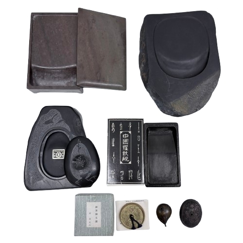 - ▲【書道具おまとめ】硯 すずり 中国硯/ペーパーウェイト 文鎮 原益夫 作/水差し 書道 美術 筆記具 セット★