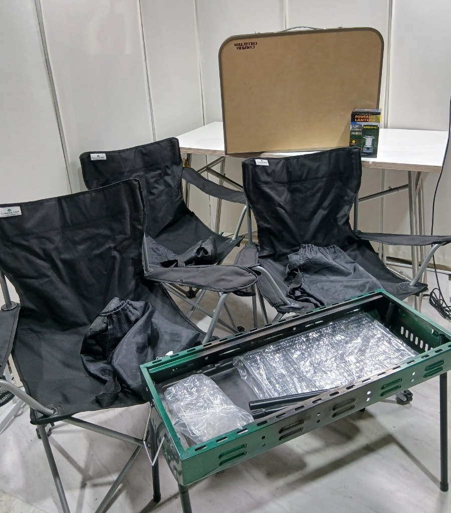 > #370 キャンプ アウトドアチェア BBQセット☆/コンロ、イス三脚、折り畳みテーブル、ランタンのセットです◎和歌山県にて引き取り大歓迎