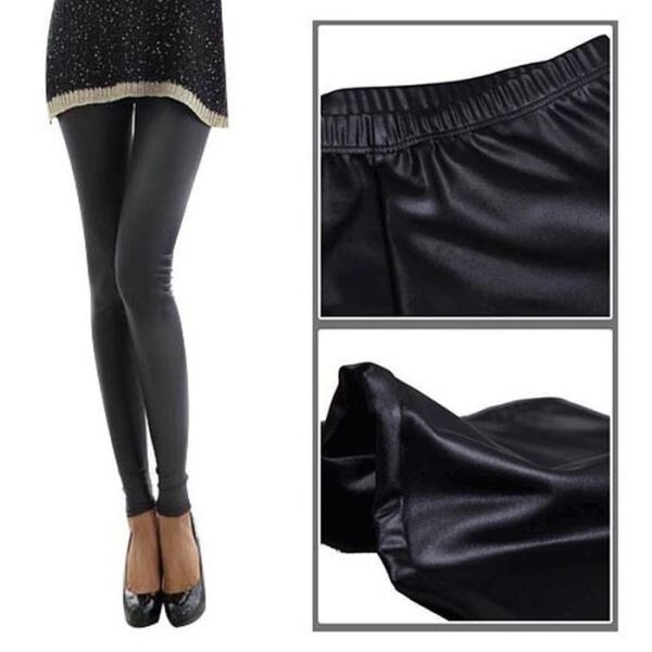 - スキニーパンツ ロング丈 革風レギンス ストレッチ ウェストゴム ハイウェスト フェイクレザー レディース ブラック XXL
