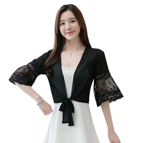 - ボレロカーディガン ショート丈 肩掛け 薄手 カーデ トッパー 女性 春夏 6分袖丈 シフォン素材 透け感 裾結び ブラック Mサイズ