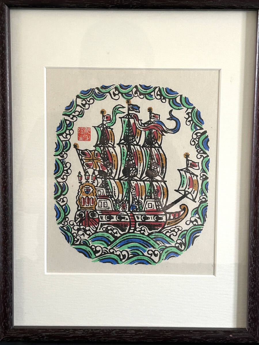 - 【真作】 木版画 川上澄生作 波囲い南蛮船