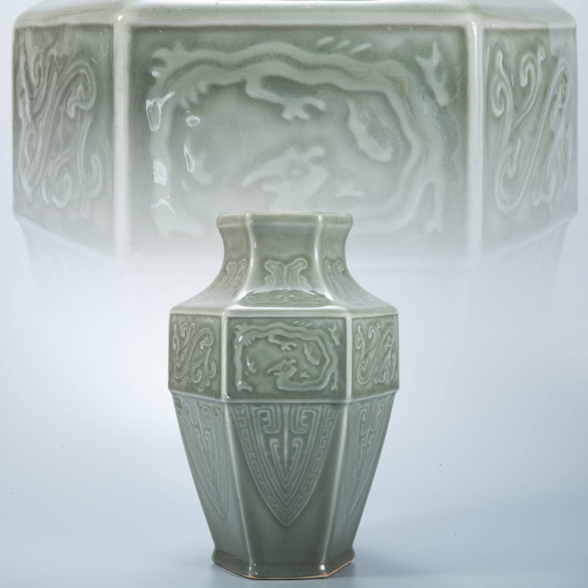 - BR27680-中国美術 青磁 陰刻 龍文六角花瓶 唐物 高30.5cm
