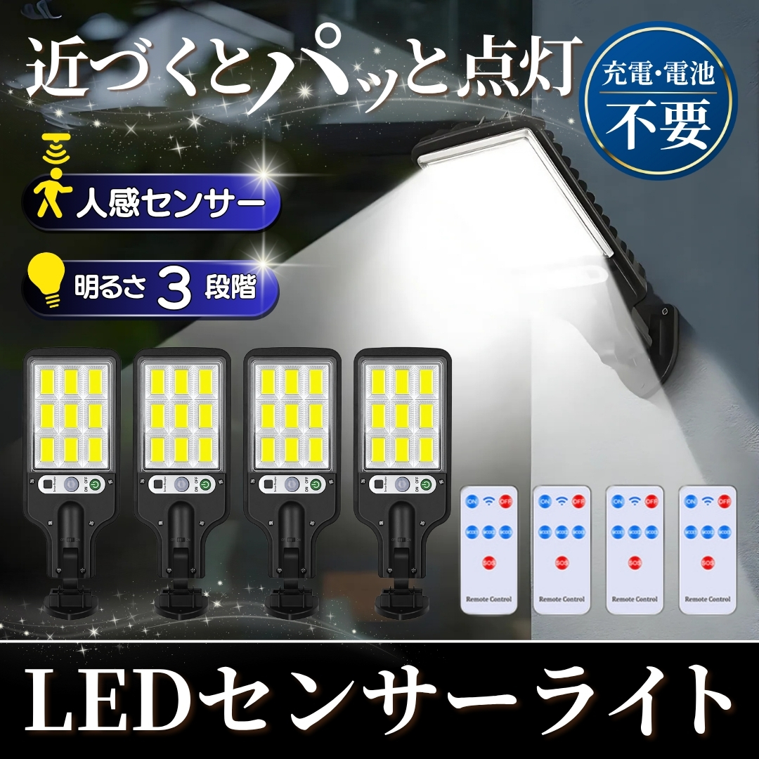 - 108COB ソーラーセンサーライト LED 4個セット 人感センサー 防犯 屋外 明暗 誘導式街路灯 防水 照明 ガーデンライト 点灯 自動 高輝度
