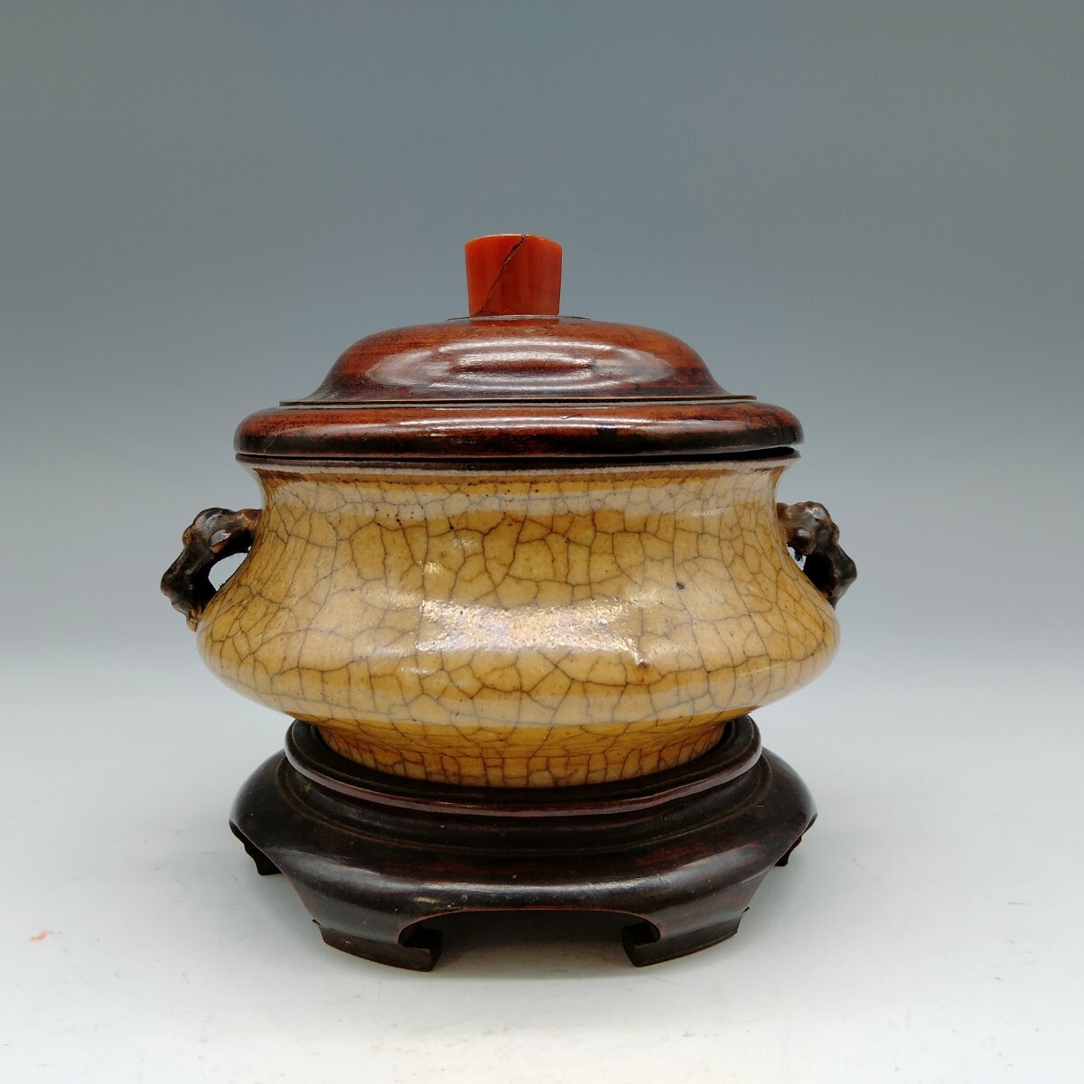 - 中国美術 青磁香炉 香道具 唐木蓋台付き 瑪瑙摘み 双耳香炉