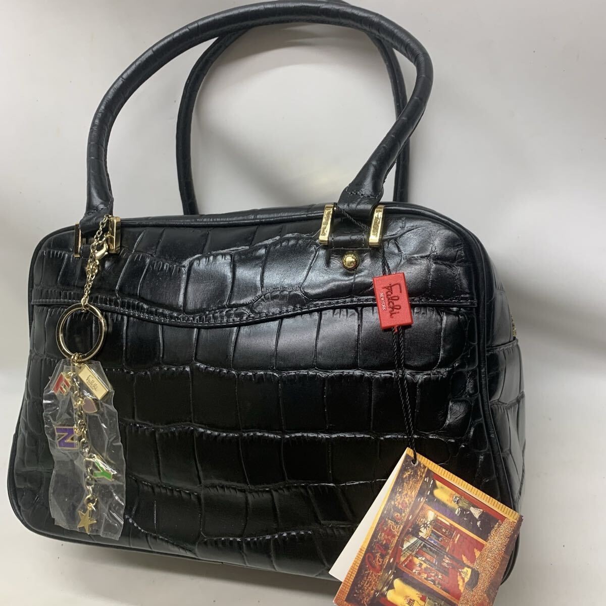 > 【新品未使用】ファルチ ニューヨーク Falchi クロコ型押しレザーバッグ 牛革 黒 ブラック チャーム付き ボストン ミニボストンバッグ