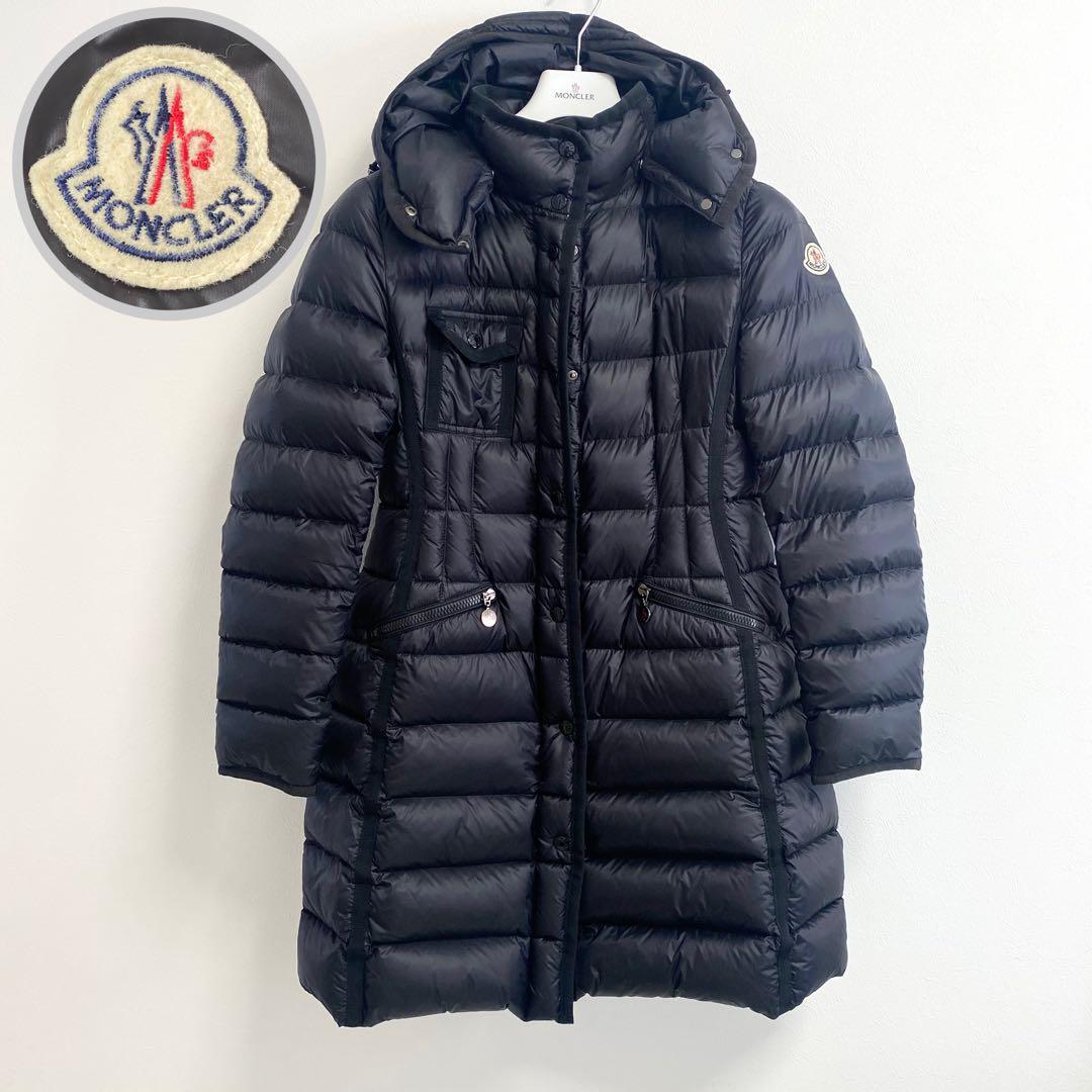 > 【美品】MONCLER モンクレール HERMINE エルミンヌ ダウンジャケット 2 ブラック 黒 ロングコート フード付きワッペン
