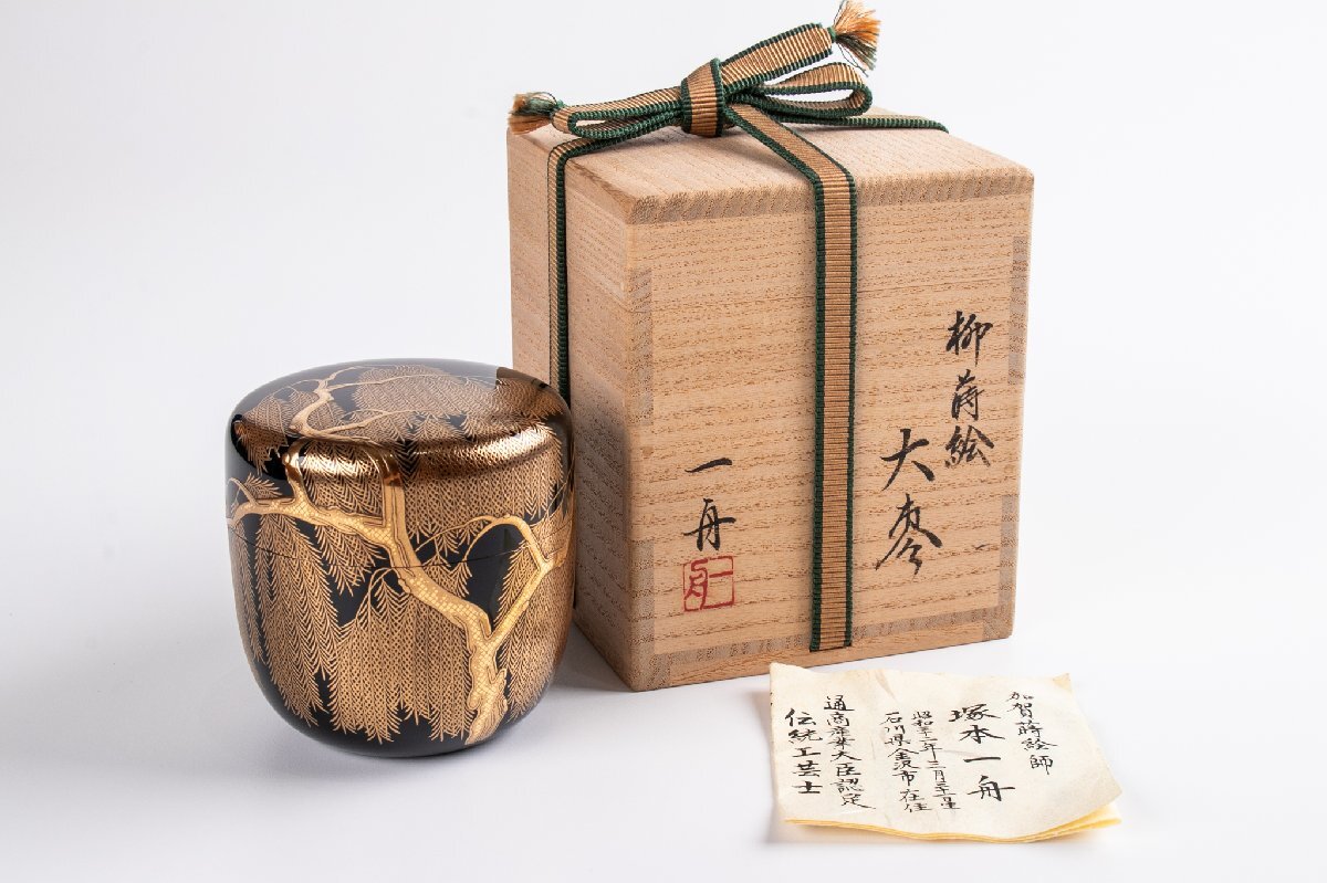 - 【うつわ】 茶道具 塚本一舟 柳蒔絵大棗 内梨地 加賀蒔絵師 共箱 016 古美術 骨董 古玩 唐物 茶道具 懐石 日本料理 料亭