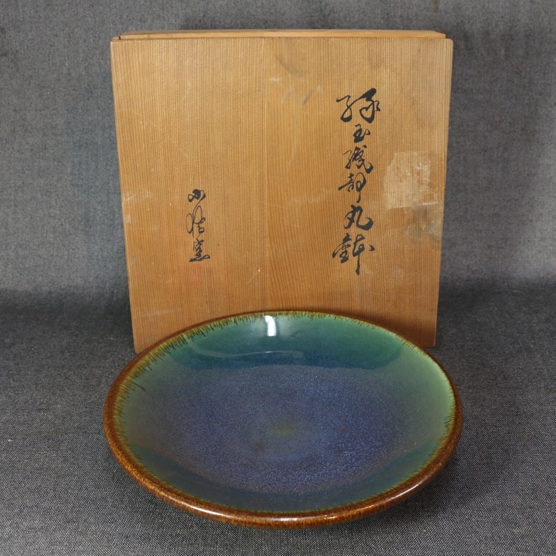 - ★小樽窯 (白勢栄悦) 緑玉織部丸鉢 共箱 大皿★