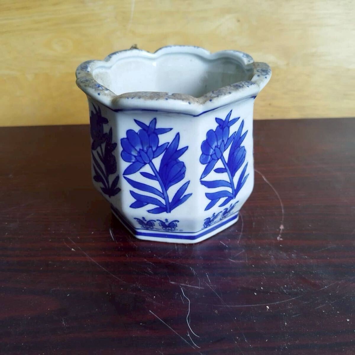 - 西A01 時代物 盆栽 盆栽 ミニ 豆盆栽鉢 青絵 花四面 正方鉢 六角植木鉢 観葉植物