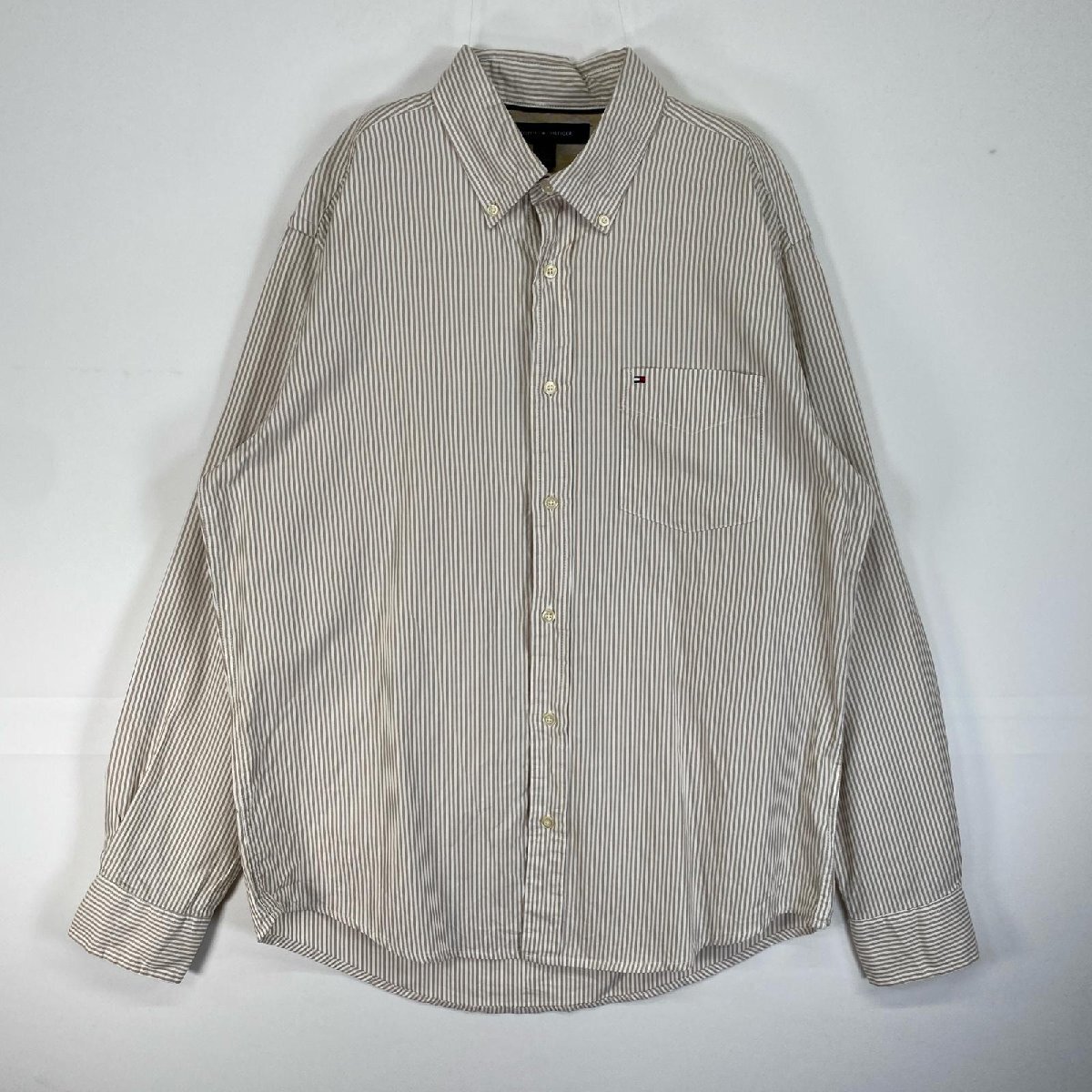 > 古着 トミーヒルフィガー TOMMY HILFIGER 長袖シャツ ロゴ 刺繍 ボタンダウン M ベージュ系 ストライプ メンズ