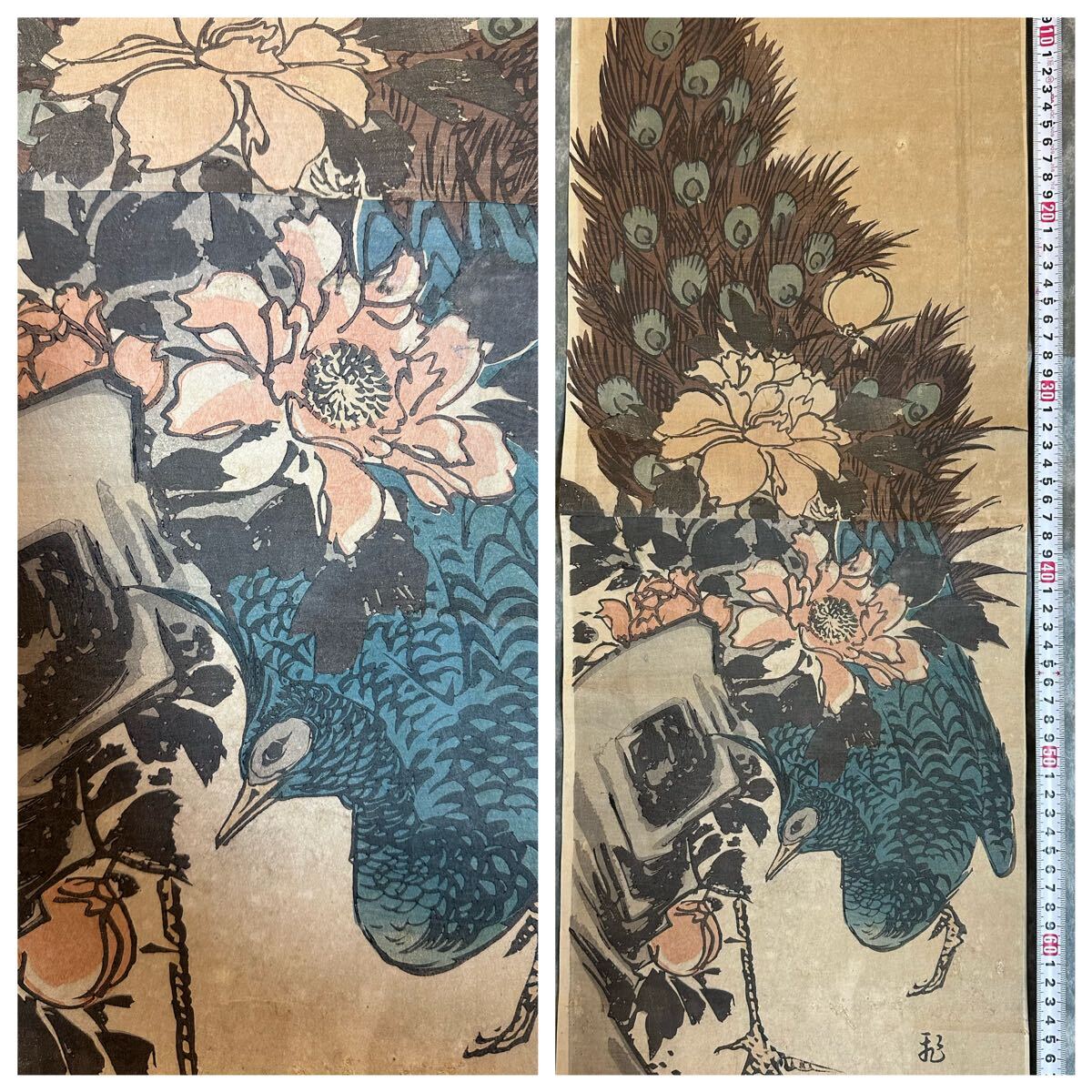 - 【真作】江戸期 本物浮世絵木版画 秘蝶「牡丹に孔雀」花鳥図 大判 錦絵 保存良い 二枚続き 掛軸付き