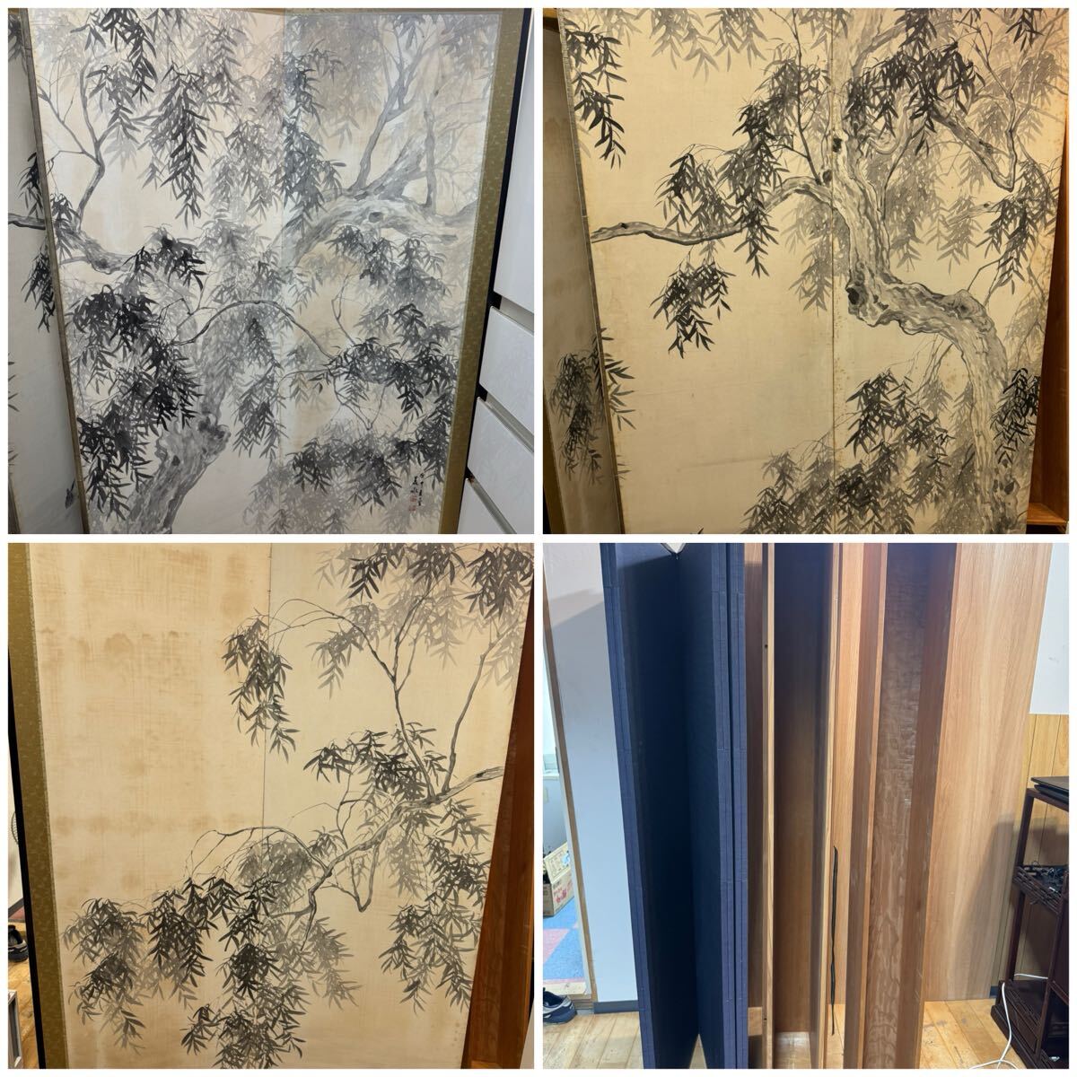 - 【古美術】六曲一隻 屏風 水墨画 竹林図 作家落款有 木箱付 高さ175cm 現状品