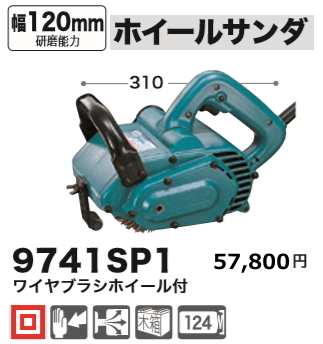 マキタ ホイールサンダ 9741SP1 定価57,800円(税別) ■主要機能 研磨能力:幅120mm ホイール径100mm 回転数3500 電源:単相100v 電流:11A 消費電力:1050w 質量:4.2kg コード5m ■付属品 ワイヤブラシホイール(A-23341) ・ジョイント(弊社集じん機接続用) ・六角レンチ6(2本)
