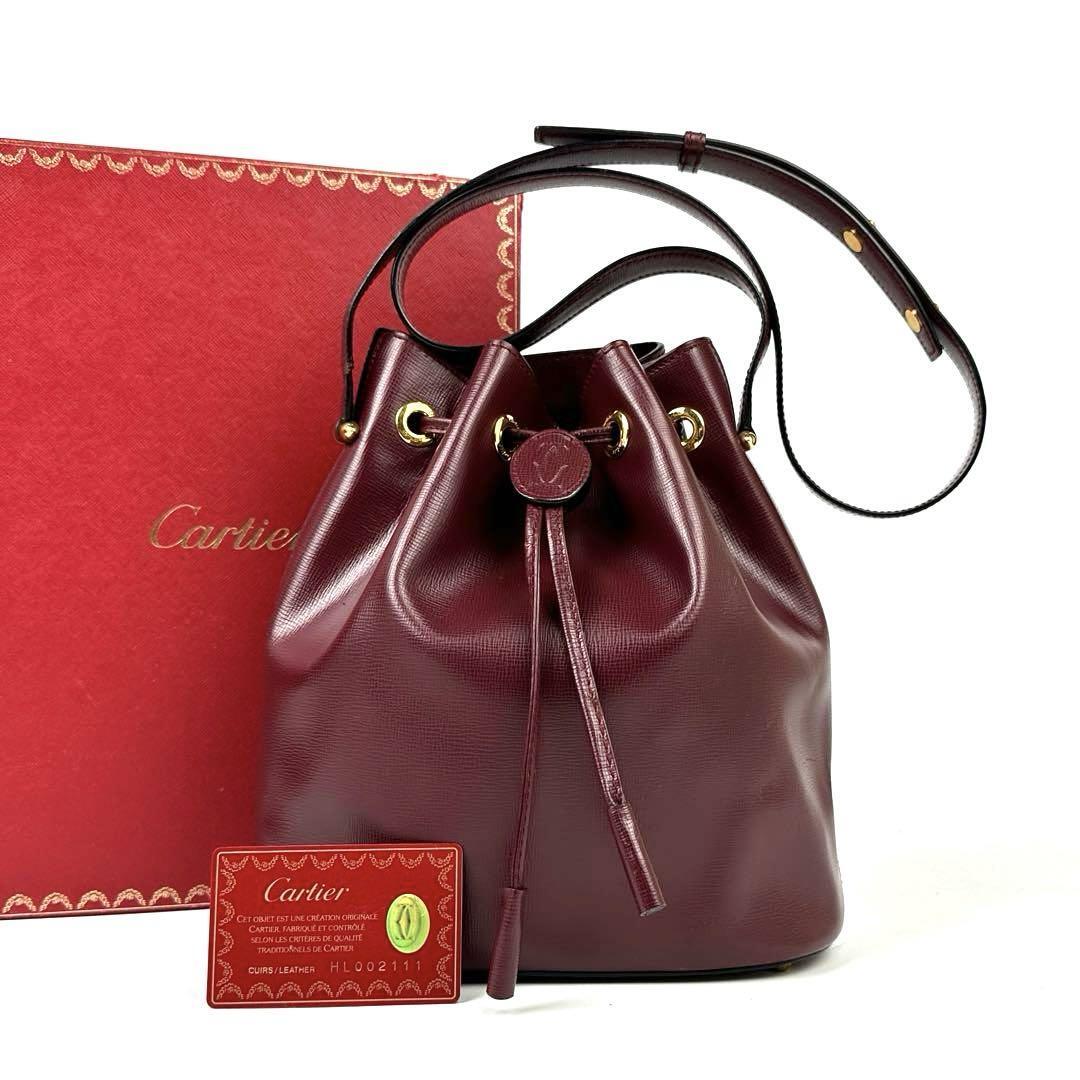 - 美品 Cartier カルティエ マストライン 巾着 ショルダーバッグ ゴールド金具 ロゴ型押し 男女兼用 フォーマル レザー ボルドー カード付属