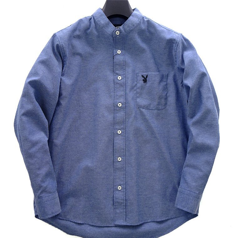 > 新品 プレイボーイ 25年春夏 オックス バンドカラー シャツ L 紺 【PB251027_79_L】 PLAYBOY 長袖 ロゴ 刺繍 オックスフォード コットン