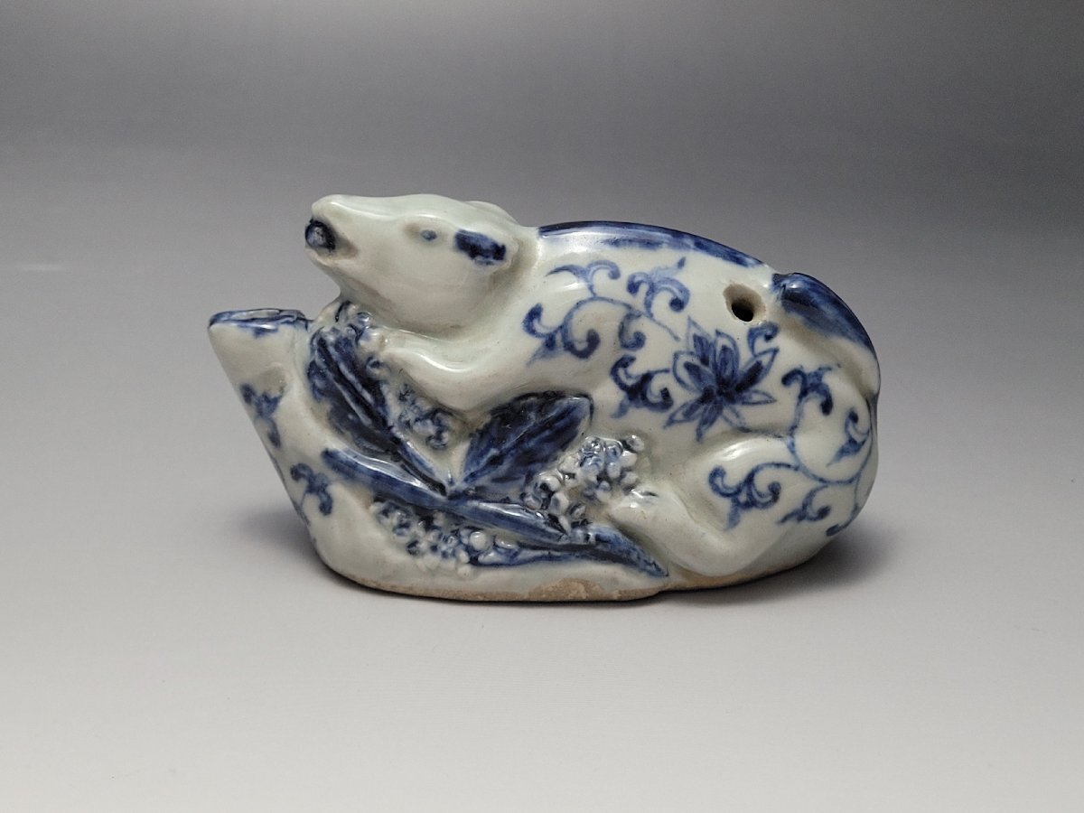 - 染付 リス型 松鼠型 折枝花紋 硯滴 水滴 幅約11.1cm / 明清時代 書道具 書画道具 文房具 古美術 唐物 人間国宝 李朝 高麗 古玩 古董