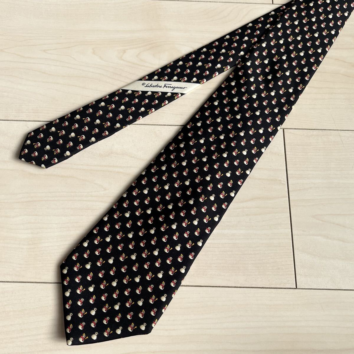 - 美品 Salvatore Ferragamo サルヴァトーレフェラガモ 雪だるま柄 ネクタイ 黒