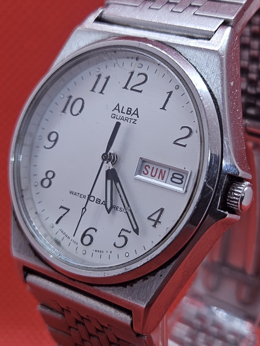 > 稼働品 SEIKO セイコー ALBA アルバ V743-8A10 アナログ クォーツ メンズ腕時計 ホワイト文字盤 デイデイトカレンダー 電池交換済み G3075